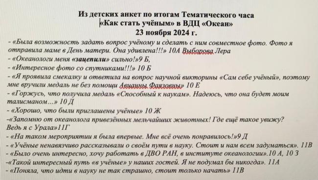 Также 23 ноября 2024 г. сотрудники ТОИ ДВО РАН приняли участие в проведении профориентационного тематического часа «Как стать ученым». Ученые из академических институтов пообщались с ребятами и рассказали им о том, как складывался их путь в мир науки.