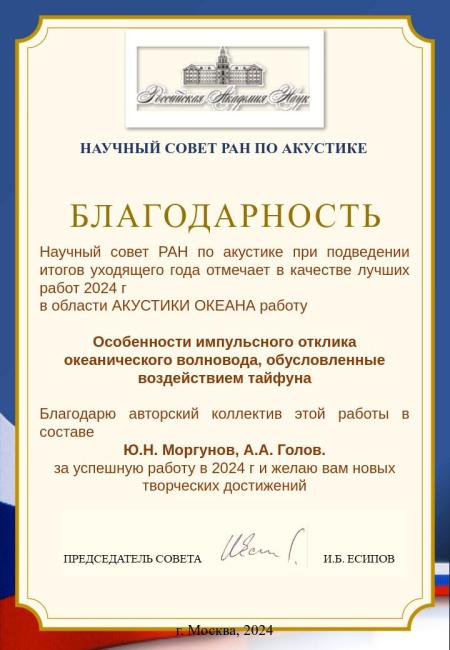 заведующего лабораторией акустической томографии д.т.н. Юрия Николаевича Моргунова и старшего научного сотрудника лаборатории акустической томографии к.т.н. Александра Александровича Голова «Особенности импульсного отклика океанического волновода, обусловленные воздействием тайфуна»;