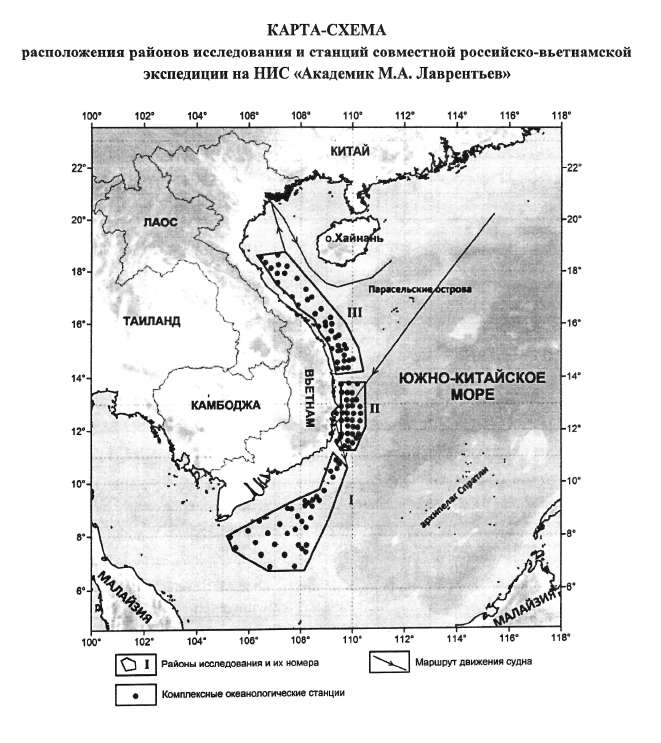 Выполнение комплексных геолого-геофизических, геохимических и океанографических исследований на привьетнамской акватории Южно-Китайского моря для решения проблемы условий и механизмов формирования трех важных осадочных бассейнов, изучения газовых потоков и природы кристаллических пород.