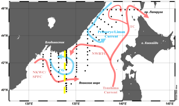 - проведены измерения от поверхности до дна (> 3500 м) на мониторинговом климатическом разрезе вдоль 134 в.д. до возвышенности Ямато, результаты которого дадут информацию о современном тренде потепления глубинных вод Японского моря и изменении их биогеохимических характеристик;