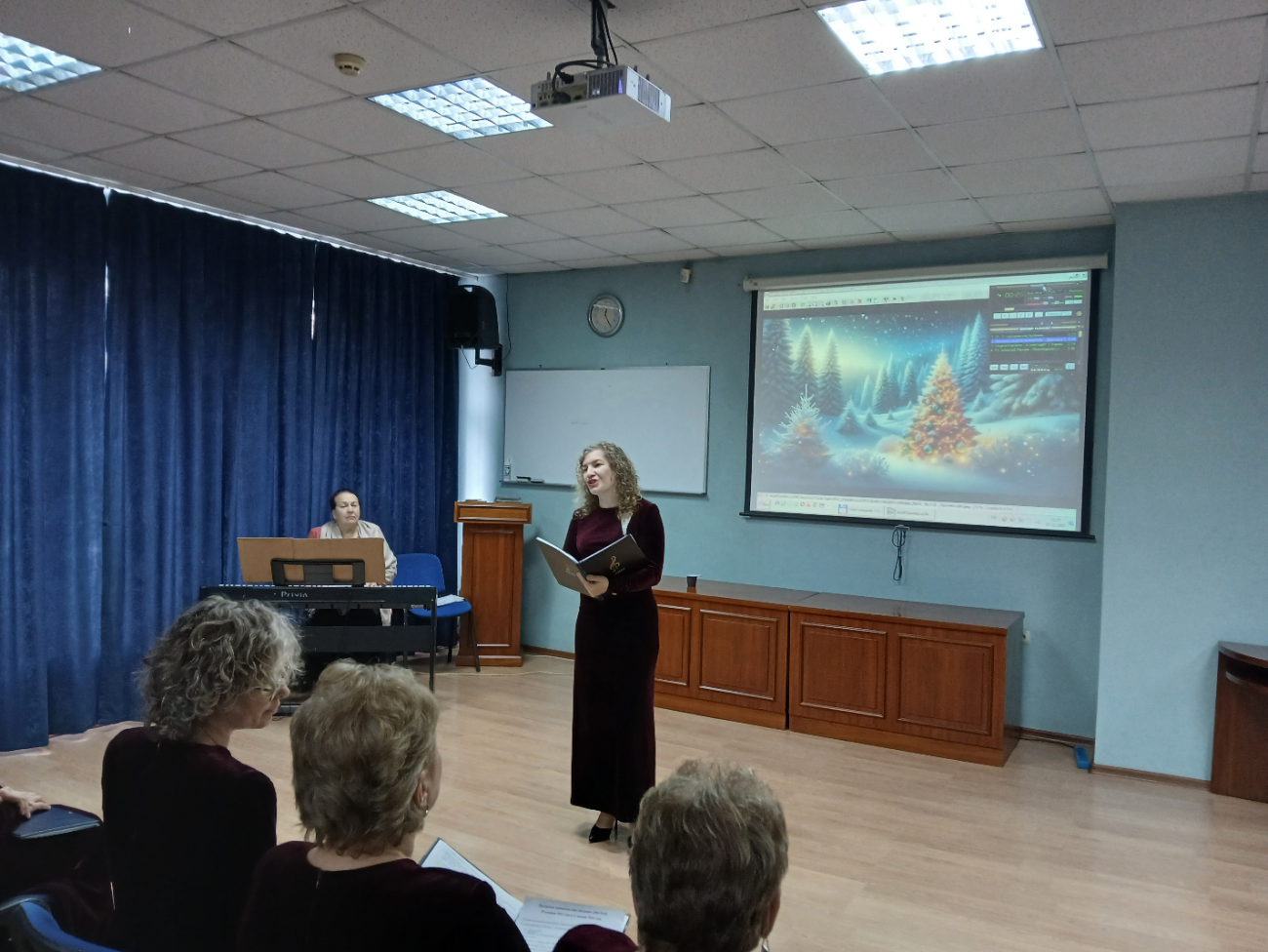Далее состоялся праздничный концерт "Настроение - Новый год" академического камерного хора "Коллаж" профсоюза ДВО РАН. Художественным руководителем хора является Галина Саводерова, концертмейстер- Татьяна Онищенко. В состав хора входят и наши сотрудники: ведущий специалист отдела учёного секретаря Наталья Валериевна Можеровская и сотрудник лаборатории седиментологии и стратиграфии, д.г.-м.н. Анатолий Викторович Можеровский.
