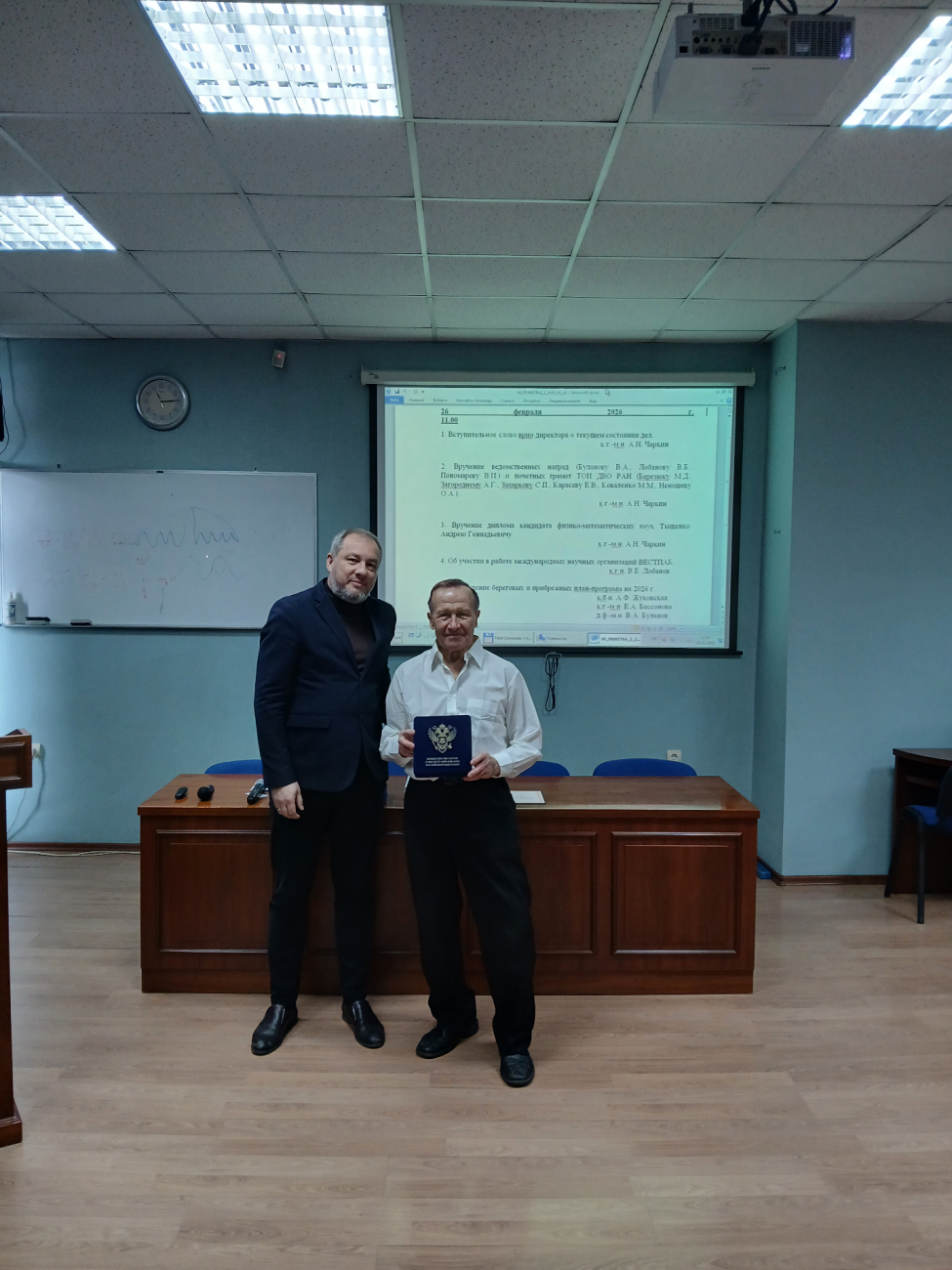 26 февраля 2026 г. в рамках заседания Ученого совета состоялось награждение сотрудников ТОИ ДВО РАН. Врио директора к.г.-м.н. Александр Николаевич Чаркин вручил ведомственные и институтские награды.