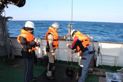 После суток «охоты» за газовыми сипами было отмечено несколько наиболее интересных точек для проведения геологических и гидрологических исследований. На одной из таких точек, вечером 22 октября провели первую гидрологическую станцию, а затем 23 октября выполнили пять комплексных океанографических станций (зондирование толщи воды, отбор проб воды батометрами и отбор проб донных отложений бокскорером).