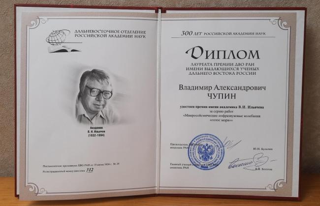 Председатель ДВО РАН академик РАН Кульчин Юрий Николаевич поздравил и вручил диплом лауреата премии ДВО РАН имени выдающихся ученых Дальнего Востока России заведующему лабораторией физики геосфер ТОИ ДВО РАН к.ф.-м.н. Чупину Владимиру Александровичу. Владимир Александрович удостоен премии имени академика В.И. Ильичева за серию работ «Микросейсмические инфразвуковые колебания «голос моря».