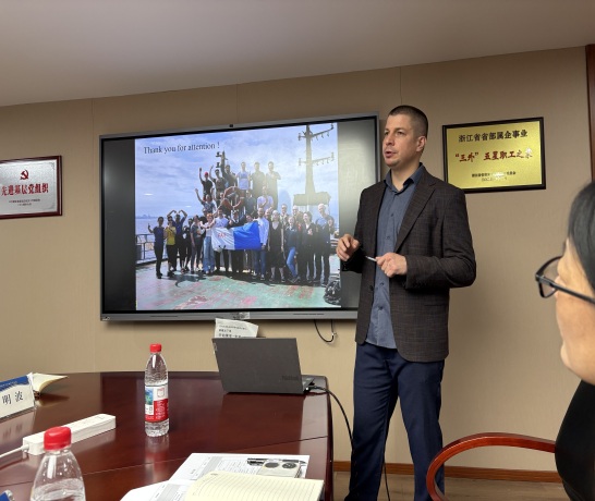 В рамках визита П.Ю. Семкин и Ф.А. Обрезчиков сделали устные доклады по итогам морской экспедиции на НИС «Академик Опарин» (рейс № 77). Ф.А. Обрезчиков, который участвует в экспедициях ТОИ ДВО РАН, впечатлил китайских коллег уровнем знаний, эрудиции и безупречным знанием английского языка.
