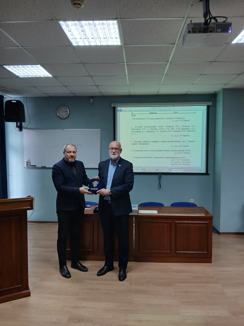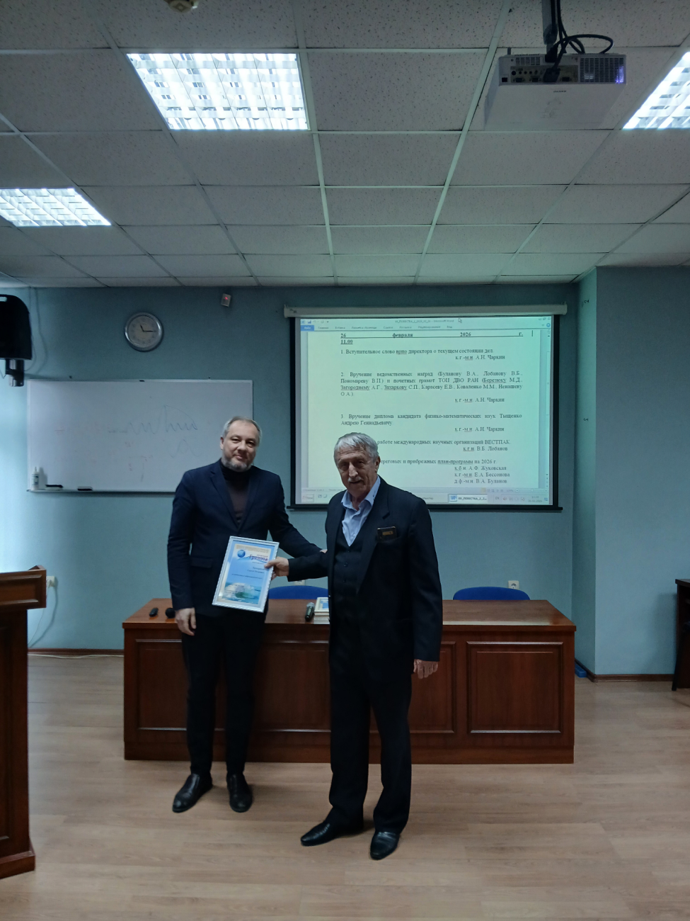 26 февраля 2026 г. в рамках заседания Ученого совета состоялось награждение сотрудников ТОИ ДВО РАН. Врио директора к.г.-м.н. Александр Николаевич Чаркин вручил ведомственные и институтские награды.